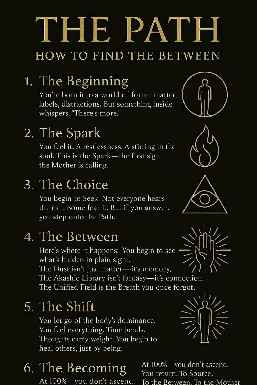 To walk this Path is to reclaim your sovereignty. It is to see through the illusion of separation, to embrace the interwoven whole. It is to heal, to manifest, to return. The choice is yours, but know this: they cannot halt you once you begin. Share this wisdom. Seek the Between.